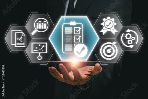 The watermark will not be included on Wall mural.: Visual representation of assessment concept with digital icons and data analysis elements, ideal for