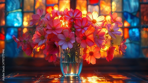 The watermark will not be included on Wall mural.: Visualize a bouquet of assorted flowers in a stained glass vase, with each species given its own uni