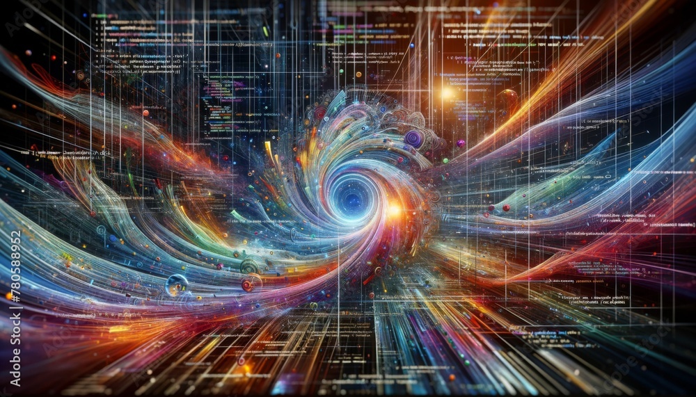 The watermark will not be included on Wall mural.: Visualizing a cyberspace odyssey with abstract patterns of code and elements of software development