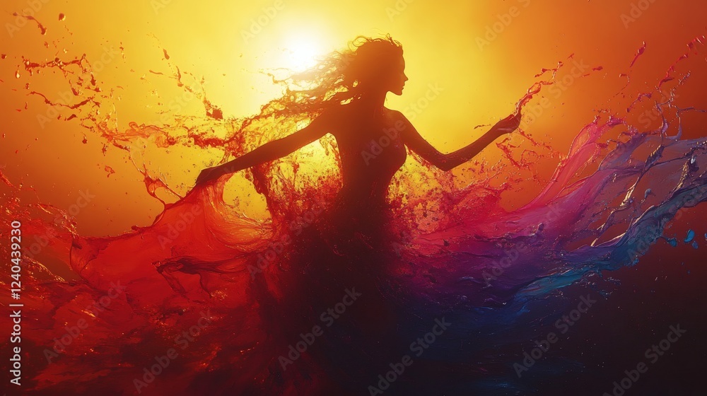 Wall mural visually stunning rendering of a painter splashing vibrant paint creating an intricate female shape  - Wall murals Wall mural visually stunning rendering of a painter splashing vibrant paint creating an intricate female shape - Wall murals