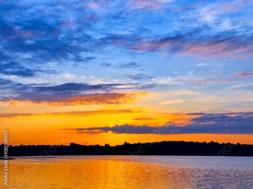 Wall mural vivid colorful color of sunset with clouds.sunset with mountain above lake reflection in water.