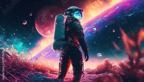 Wall mural vivid colorful illustrations of astronaut in space surfing on surfboard waves of galaxies generate a - Wall murals Wall mural vivid colorful illustrations of astronaut in space surfing on surfboard waves of galaxies generate a - Wall murals