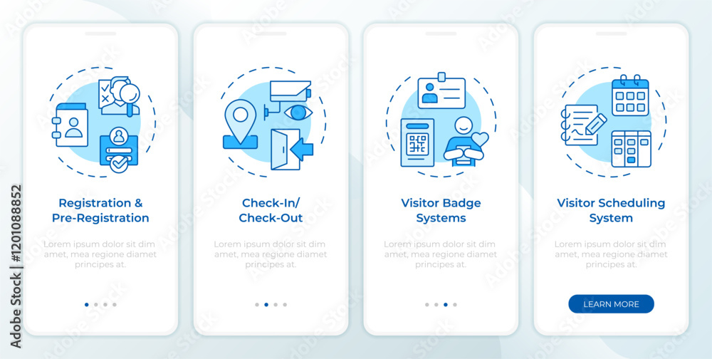 Wall mural : Vms blue onboarding mobile app screen - visitor management - walkthrough 4 steps editable graphic inst