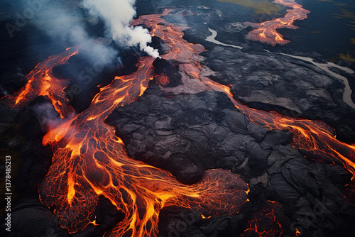 Wall mural : Volcano eruption from a bird view - volcano crater and magma flow shot from above - genertated ai -