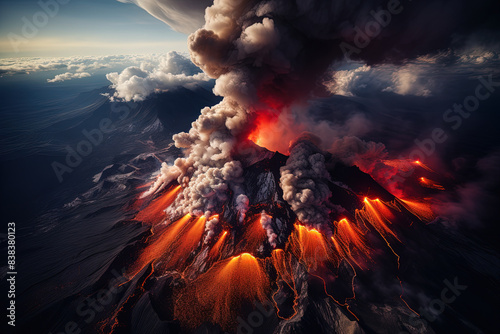 The watermark will not be included on Wall mural.: Volcano eruption from a bird view - volcano crater and magma flow shot from above - genertated ai -