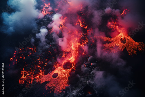 Wall mural : Volcano eruption from a bird view - volcano crater and magma flow shot from above - genertated ai -