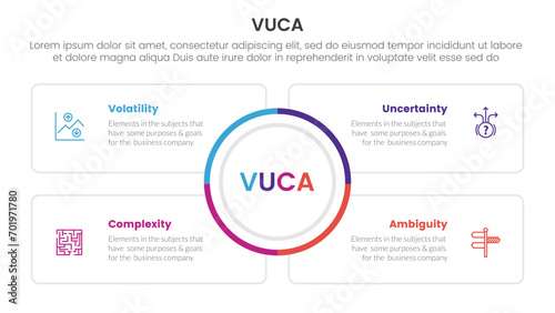 Wall mural : Vuca framework infographic 4 point stage template with big circle center and square outline box for