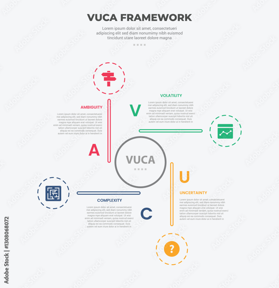 Wall mural vuca world model infographic outline style with 4 point template with circle center and long line wi - Wall murals Wall mural vuca world model infographic outline style with 4 point template with circle center and long line wi - Wall murals
