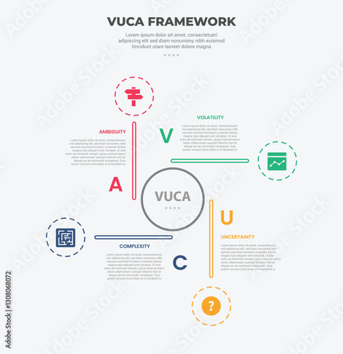 Vuca world model infographic outline style with 4 point template with circle center and long line wiWall mural