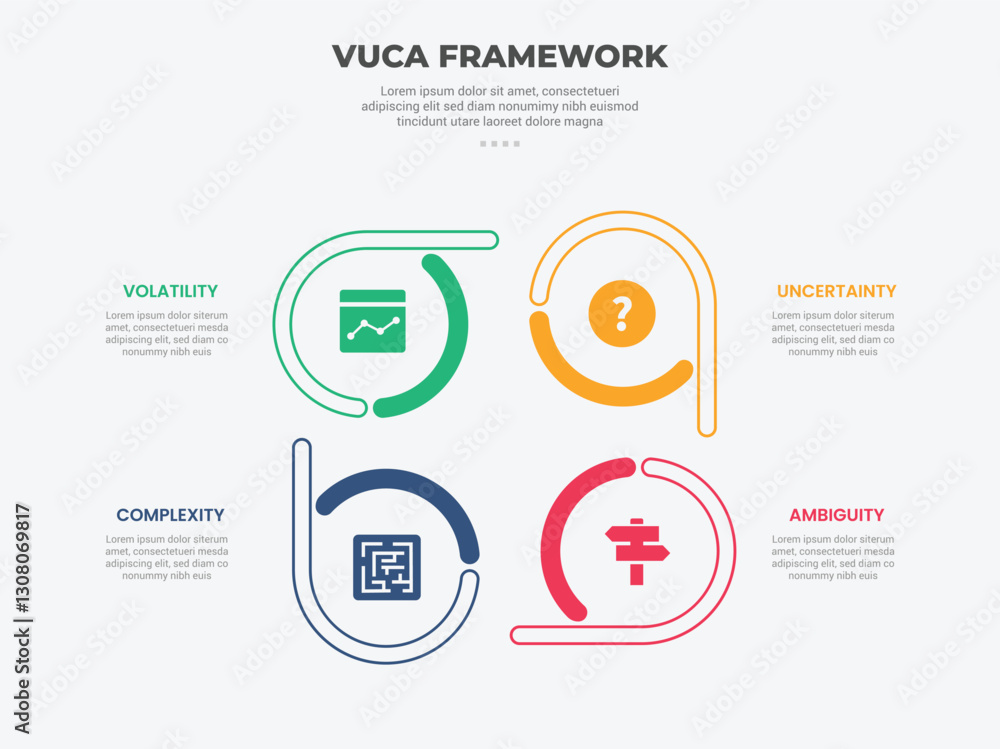 The watermark will not be included on Wall mural.: Vuca world model infographic outline style with 4 point template with creative circle on cycle circu
