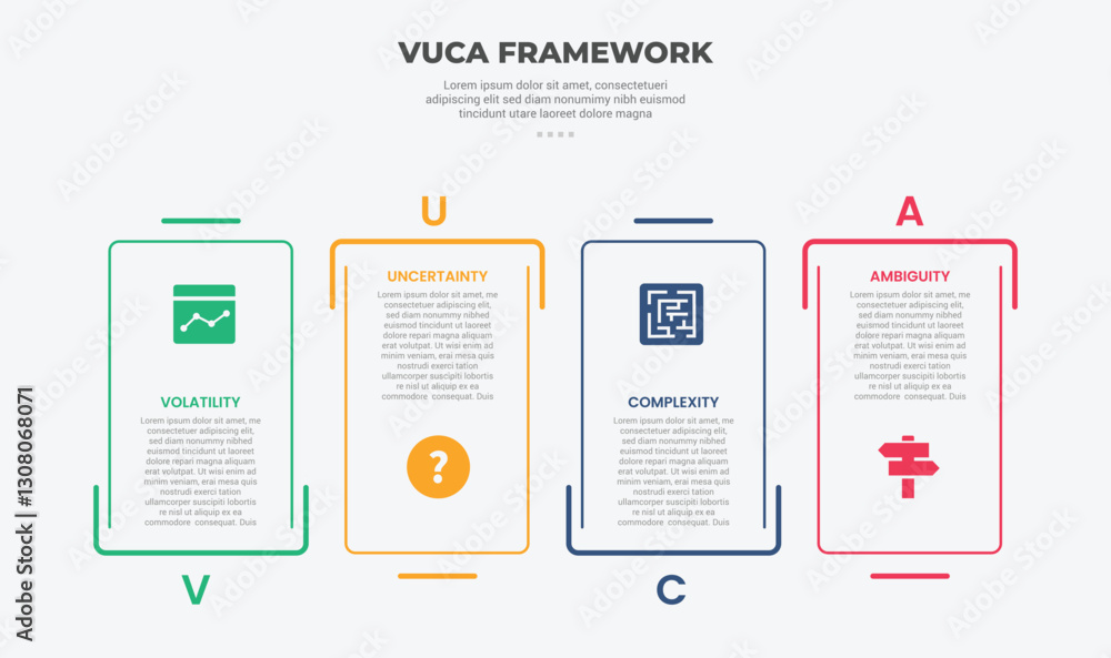 Vuca world model infographic outline style with 4 point template with creative rectangle box with seWall mural