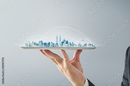 Wall mural waiter hand holding an empty digital tablet with smart cityscape and network connection concept . is - Wall murals Wall mural waiter hand holding an empty digital tablet with smart cityscape and network connection concept . is - Wall murals