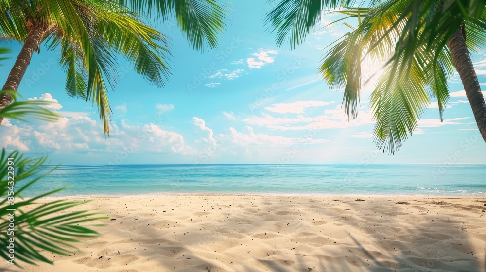 The watermark will not be included on Wall mural.: Summers paradise a blurred background of a beautiful sandy beach with palm trees and a blue sky, a p