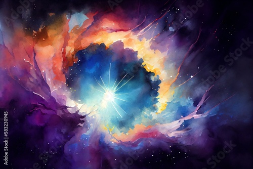 Wall mural : Watercolor illustration of a birth of a star in space during a nebula explosion - nuclear fusion of c