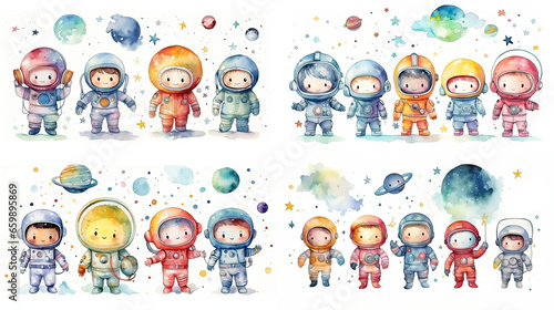 The watermark will not be included on Wall mural.: Watercolor style cartoon illustration of cute kid wearing spacesuit explore in outer space with plan