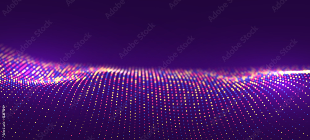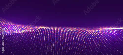 Wall mural : Wave of purple particles - abstract technology flow background - sound mesh pattern or grid landscape -