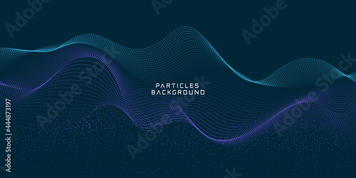 Wave vector element with abstract colorful dots line on dark background - particles flow motion illusWall mural