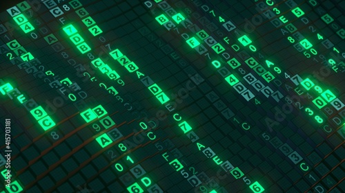 Wall mural wavy lines with glow green computer code. futuristic digital technologies concept. 3d render illustr