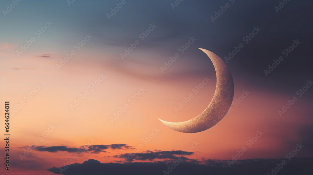 The watermark will not be included on Wall mural.: Waxing crescent moon hanging low in the twilight sky, clouds drifting gently