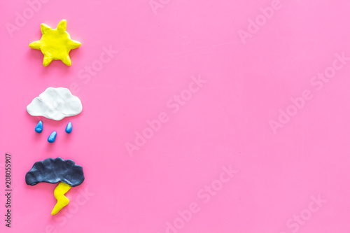 Wall mural weather forecast concept. modern weather icons set on pink background top view copy space