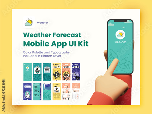 Wall mural : Weather forecast mobile app ui kit with showing temperature, weather condition for responsive websit