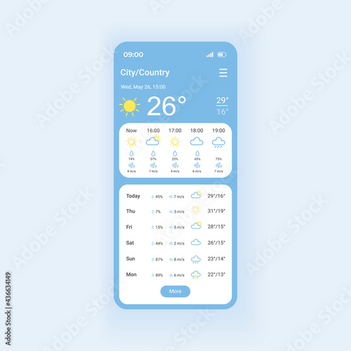 Wall mural weather forecast smartphone interface vector template. mobile app page design layout. hourly data. h - Wall murals Wall mural weather forecast smartphone interface vector template. mobile app page design layout. hourly data. h - Wall murals