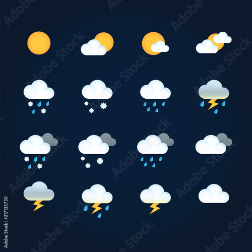 Weather icons sun and clouds in sky, rain with snow, thunder and lightning - flat vector weather and Wall mural