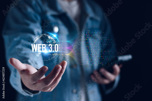 Wall mural : Web 3 - 0 concept - businessman hand show web 3 - 0 with globe - ai technology global network, future tech
