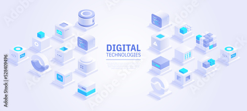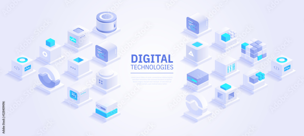 Web banner design of digital technologies concept - abstract isometric cubes with text place on whiteWall mural