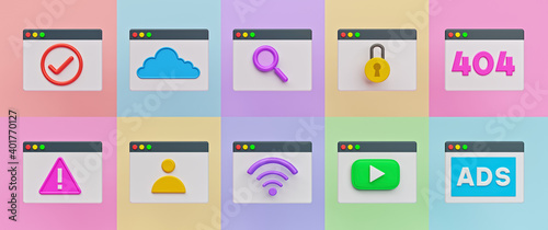 The watermark will not be included on Wall mural.: Web browser window 3d icons, symbols collection - minimal colorful graphic elements - 3d rendering