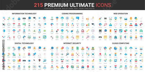 Wall mural web coding, programming and internet security color flat icons set vector illustration. abstract sym