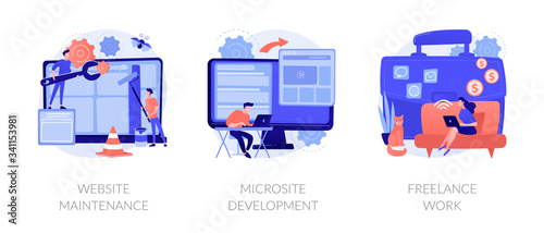 Wall mural : Web design, programming and coding idea - remote job, freelancer cartoon character - website maintenan