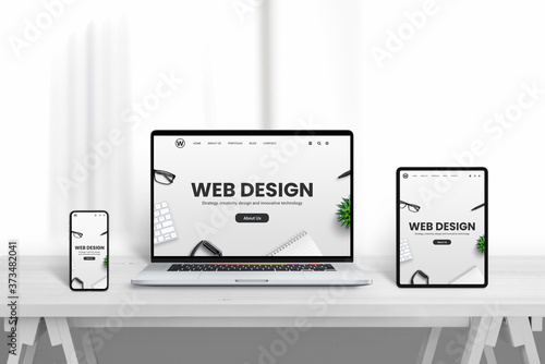 Wall mural web design company web site promotion od different devices. white wooden desk with clean background