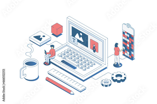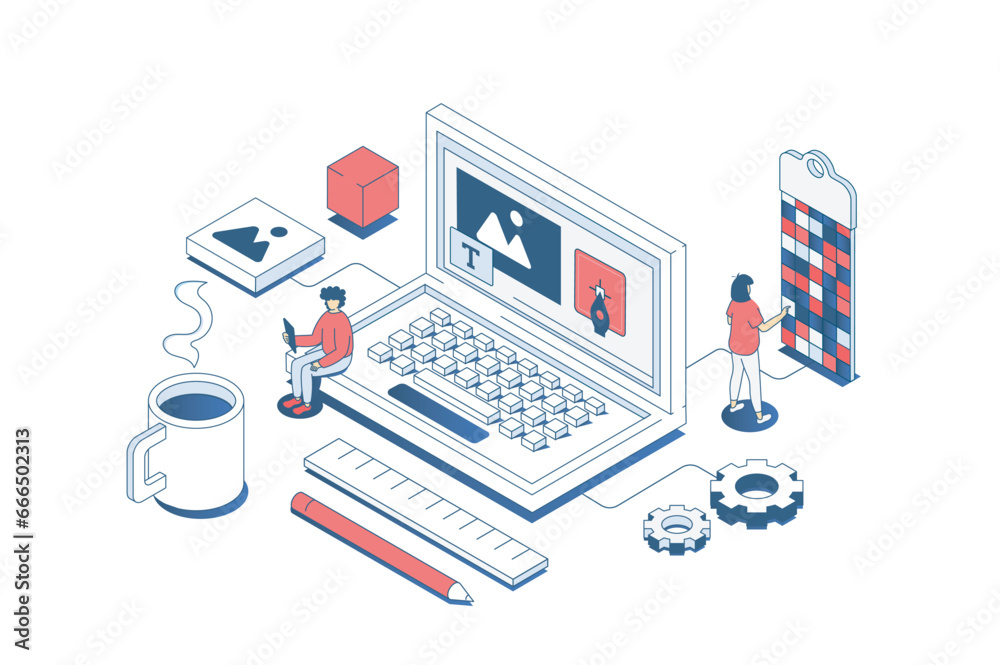 Wall mural web design concept in 3d isometric design. designer team creating digital content and site elements, - Wall murals Wall mural web design concept in 3d isometric design. designer team creating digital content and site elements, - Wall murals