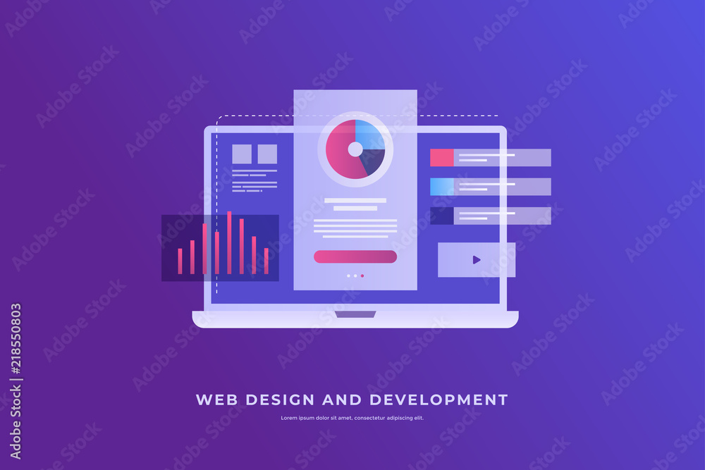 Wall mural web design concept. laptop with interface elements. digital industry. innovation and development tec