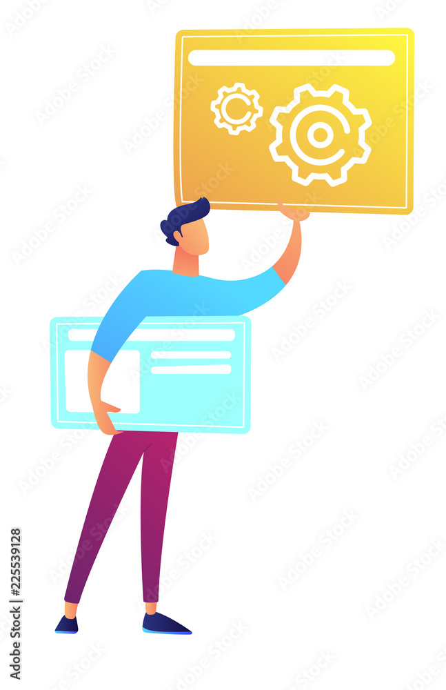 The watermark will not be included on Wall mural.: Web designer holding web pages with gears and lines vector illustration - web development and designe