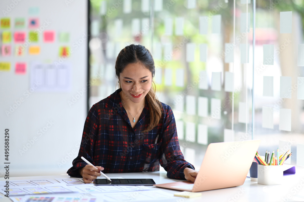 Wall mural web designer working on framework of new application for mobile phone at creative office.