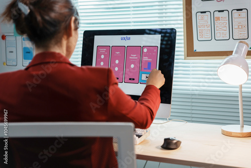 Wall mural : Web designer working on user experience for mobile application using wireframe on computer in office