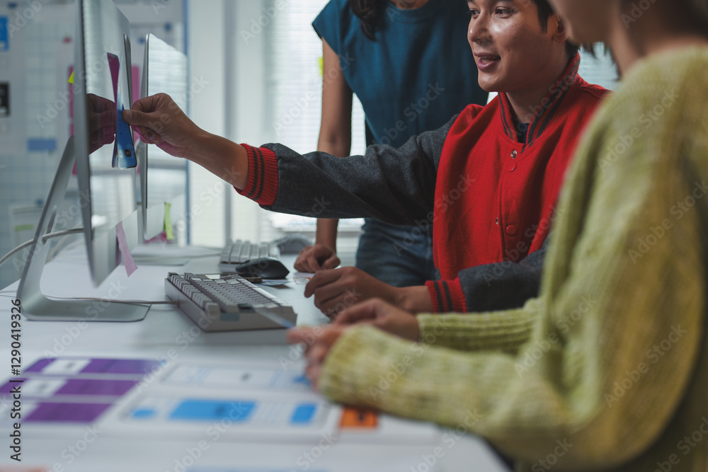 The watermark will not be included on Wall mural.: Web designers collaborating in a modern office, applying sticky notes to a monitor while planning th