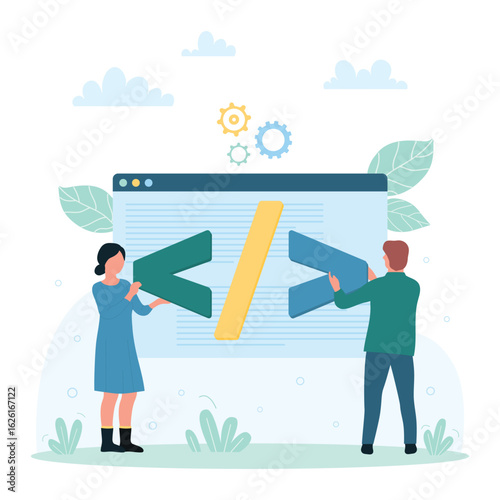 Wall mural web developement technology vector illustration. cartoon tiny people holding program digital code sy - Wall murals Wall mural web developement technology vector illustration. cartoon tiny people holding program digital code sy - Wall murals