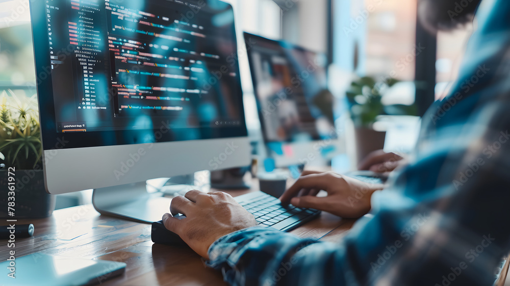 Wall mural : Web developers using a computer to conduct a/b testing on a new website feature,