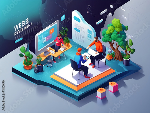 Wall mural web development concept in 3d isometric design. designers prototyping and coding, working on ui ux f