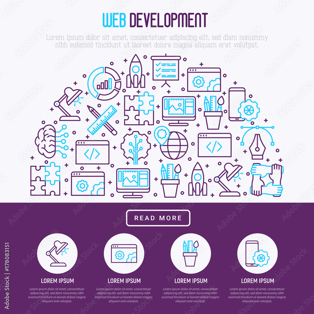 Wall mural web development concept in half circle with thin line icons of programming, graphic design, mobile a - Wall murals Wall mural web development concept in half circle with thin line icons of programming, graphic design, mobile a - Wall murals