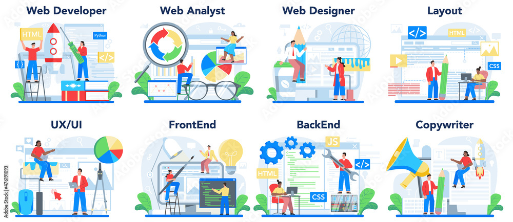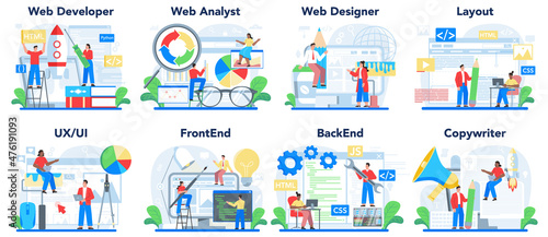 Wall mural web development concept set. creating and presenting content - Wall murals Wall mural web development concept set. creating and presenting content - Wall murals