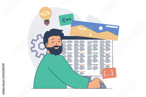 Wall mural web development concept with cartoon people in flat design. man coding page interfaces, working with