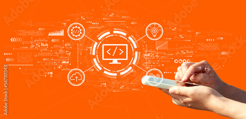 Wall mural web development concept with person using a smartphone - Wall murals Wall mural web development concept with person using a smartphone - Wall murals