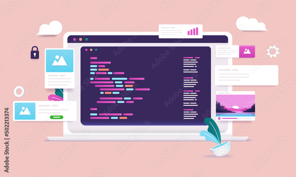 Wall mural web development - laptop computer with abstract html code on screen in cartoon style vector illustra - Wall murals Wall mural web development - laptop computer with abstract html code on screen in cartoon style vector illustra - Wall murals