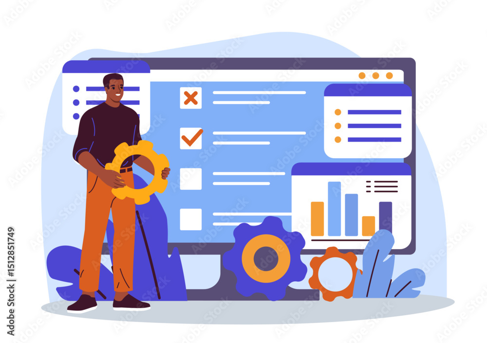 Wall mural web development man. businessman develop online platform. user create ui and ux design elements for  - Wall murals Wall mural web development man. businessman develop online platform. user create ui and ux design elements for - Wall murals