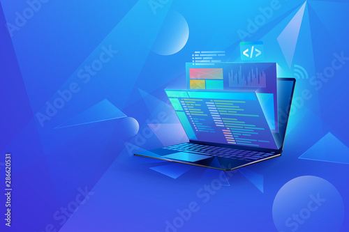 Wall mural web development technology concept design. laptop with virtual interactive screens processing, web i