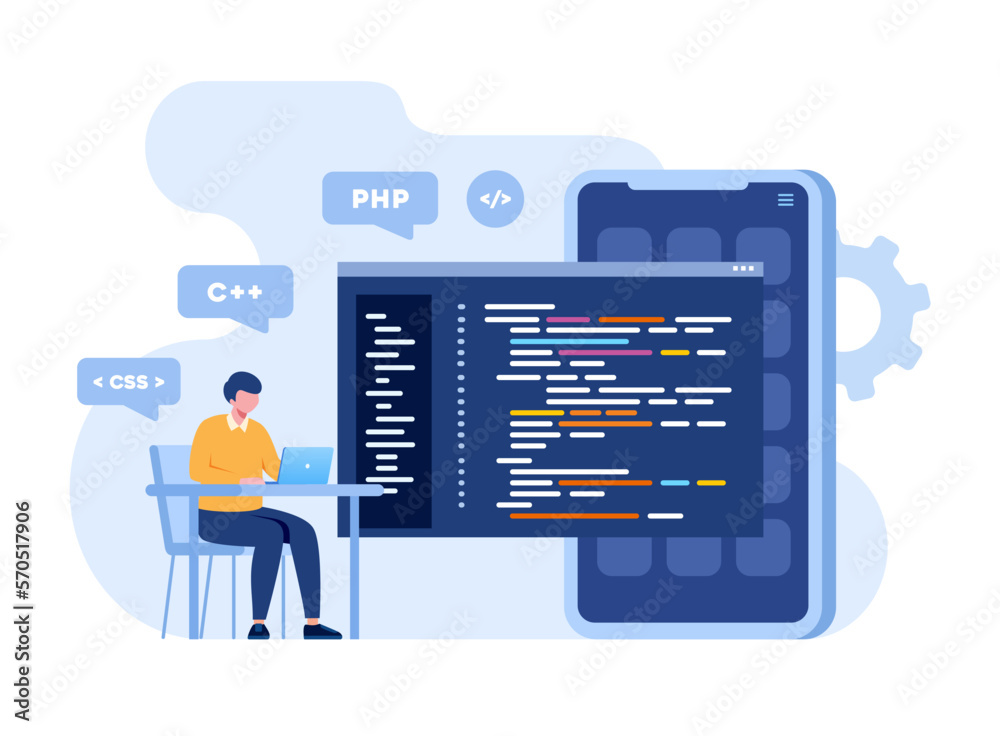 Wall mural web development. programming languages. css, html, it, ui. programmer cartoon character developing w - Wall murals Wall mural web development. programming languages. css, html, it, ui. programmer cartoon character developing w - Wall murals
